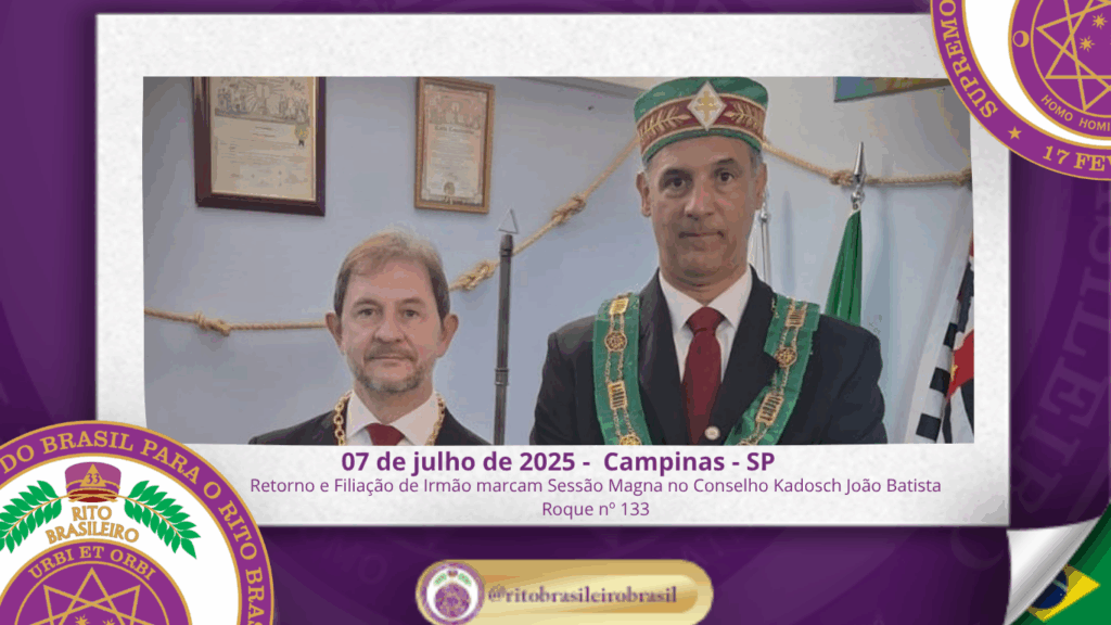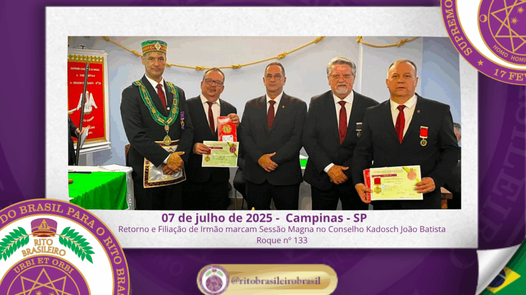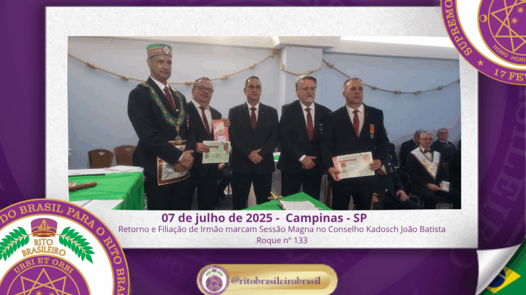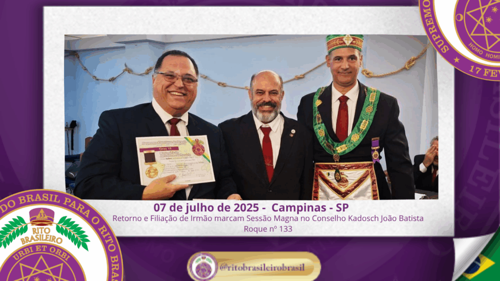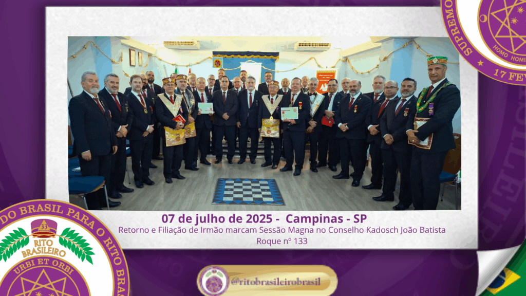 No dia 7 de julho de 2025, ao Clima de Campinas/SP, foi realizada, no Poderoso Grande Conselho Kadosch Filosófico João Batista Roque nº 133, a Sessão Magna de Colação dos Altos Graus Filosóficos, marcando mais um importante capítulo da caminhada dos obreiros comprometidos com o aperfeiçoamento moral e intelectual no seio do Rito Brasileiro.