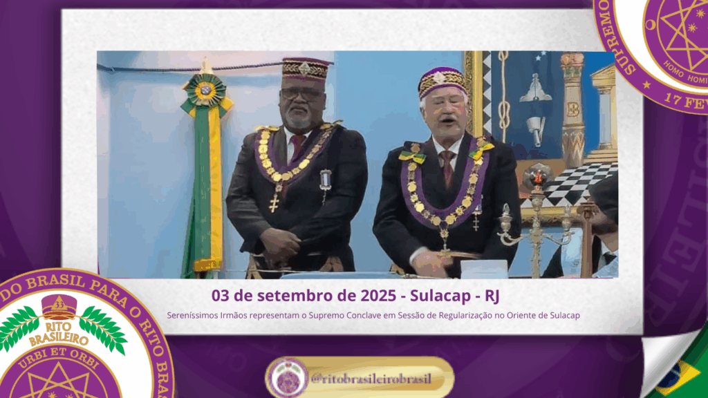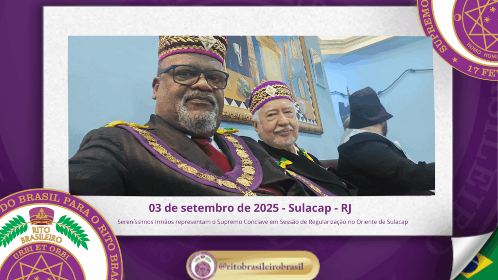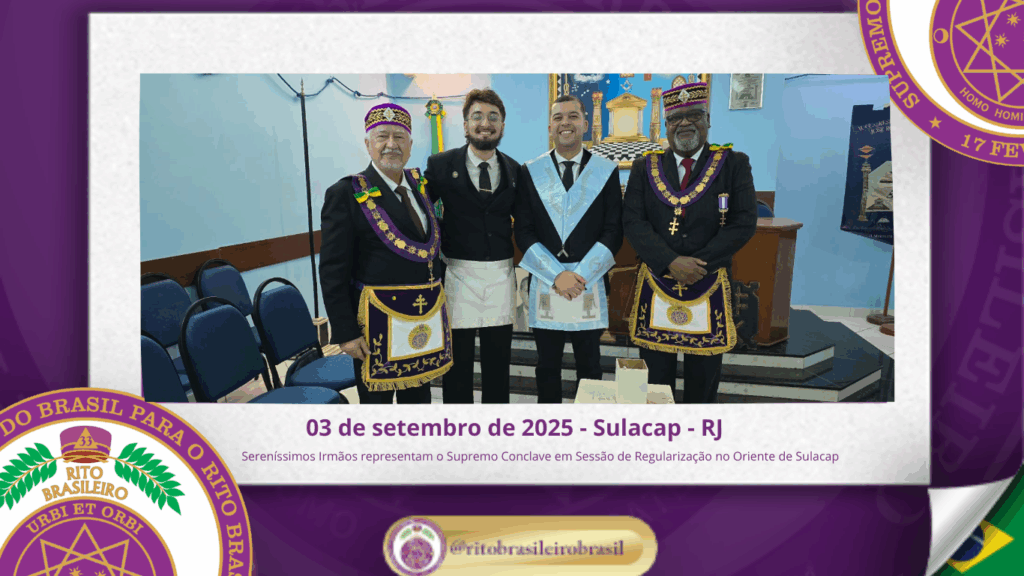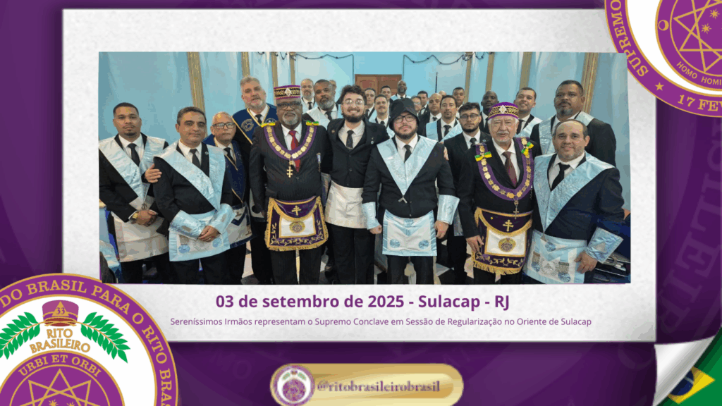 No dia três de setembro de dois mil e vinte e cinco, no Oriente de Sulacap, o Supremo Conclave do Brasil para o Rito Brasileiro de Maçons Antigos, Livres e Aceitos esteve representado pelos Sereníssimos Irmãos Eduardo Gomes de Souza, Chefe de Gabinete, e João Dias, Grande Chanceler, durante a Sessão de Regularização do Irmão Bernard Rafael Bacellar, realizada na Augusta Respeitável e Benemérita Loja Maçônica José Rocha Neto, nº 133.