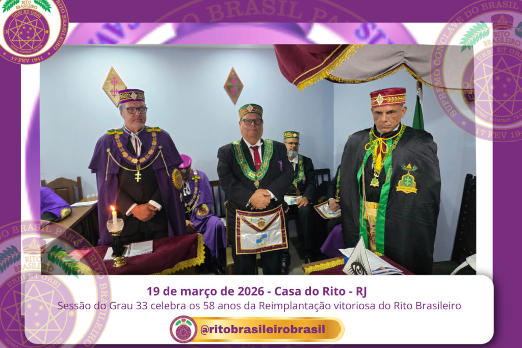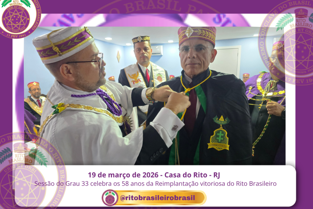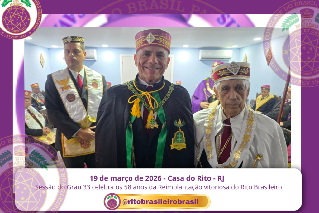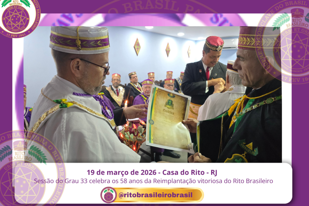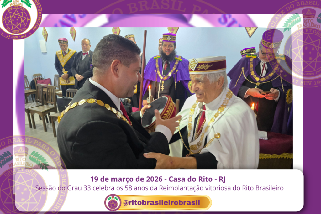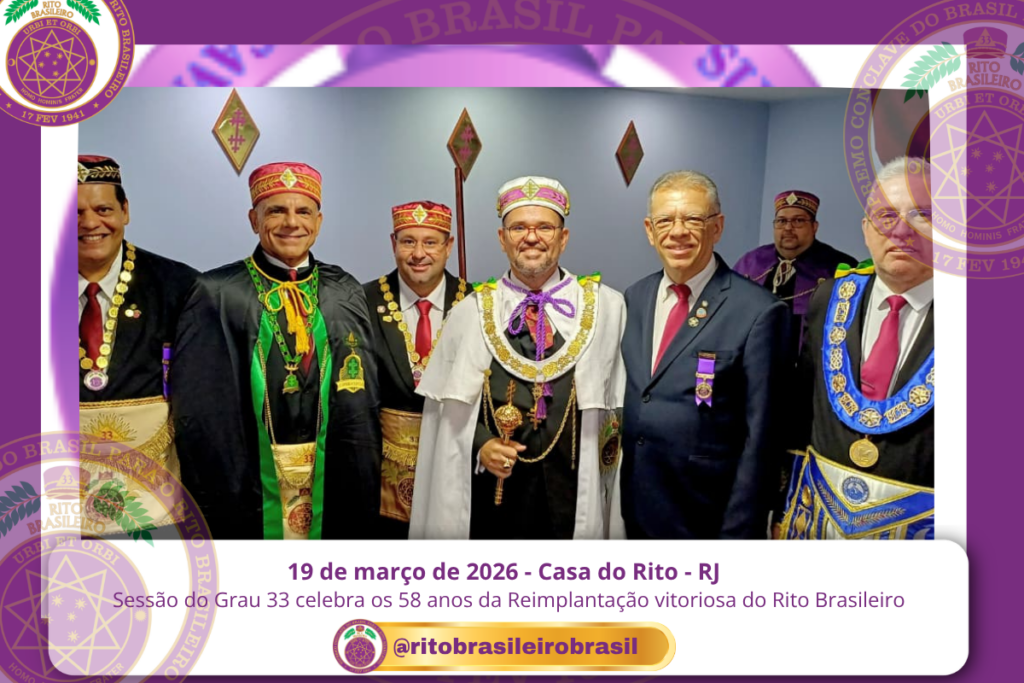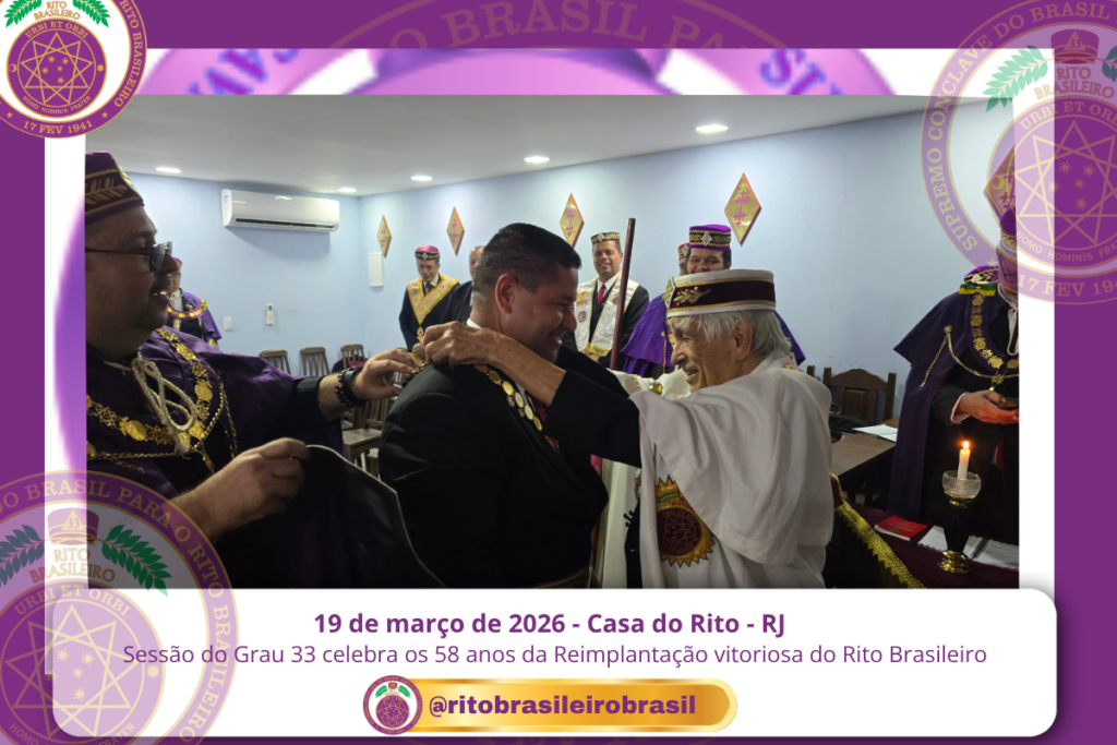No dia 19 de março de 2026, data em que são celebrados os 58 anos da Reimplantação vitoriosa do Rito Brasileiro, a Casa do Rito Brasileiro foi palco de uma emocionante Sessão do Grau 33 – Servidor da Ordem, da Pátria e da Humanidade, reunindo Irmãos em um momento histórico de celebração e fortalecimento da Ordem.