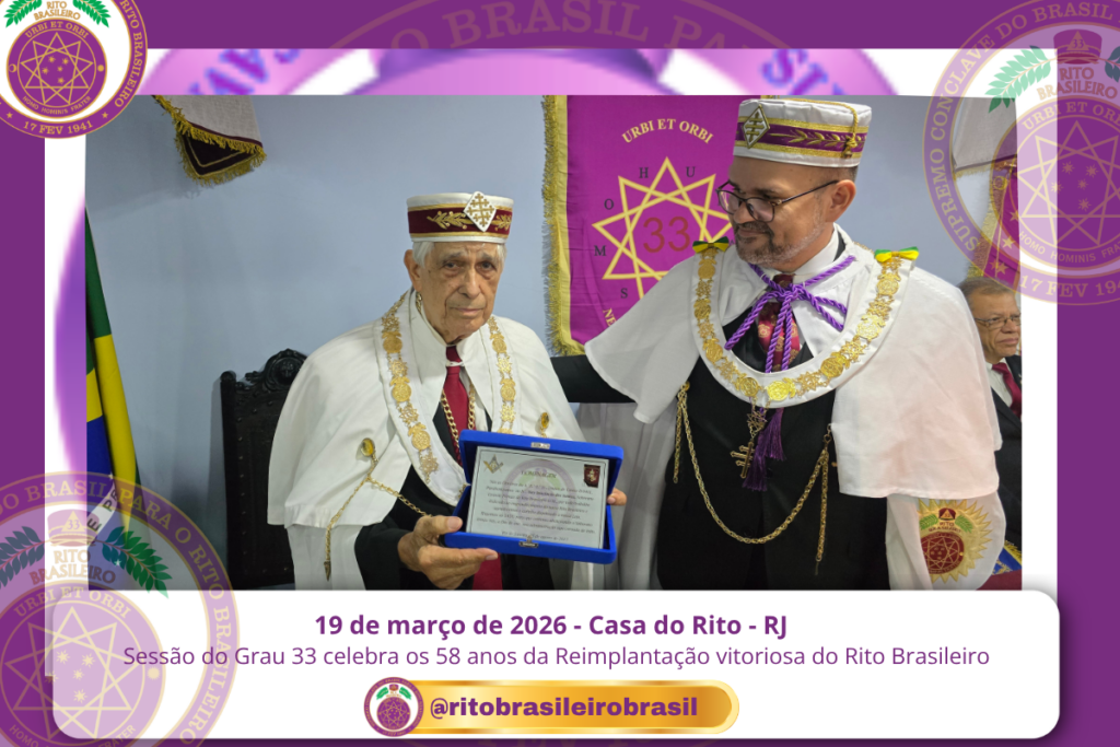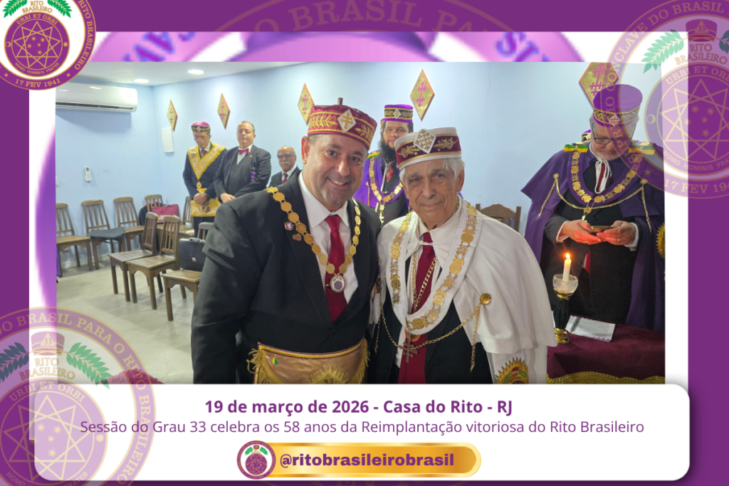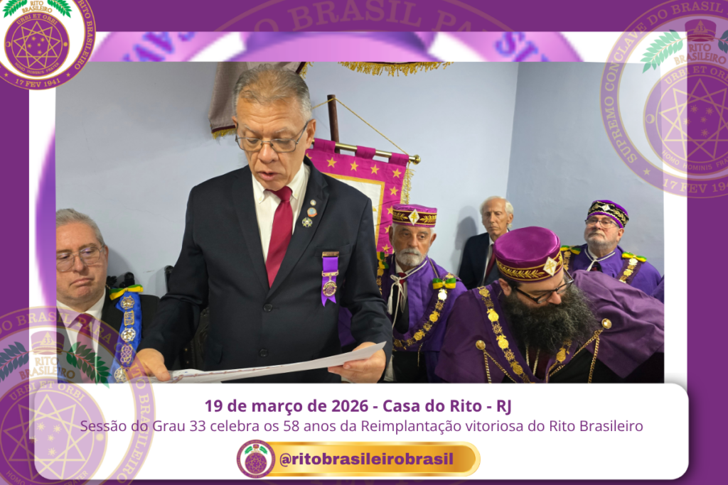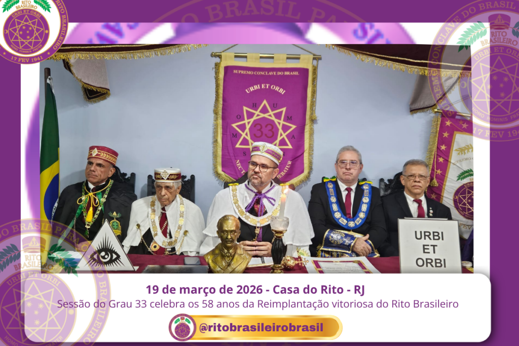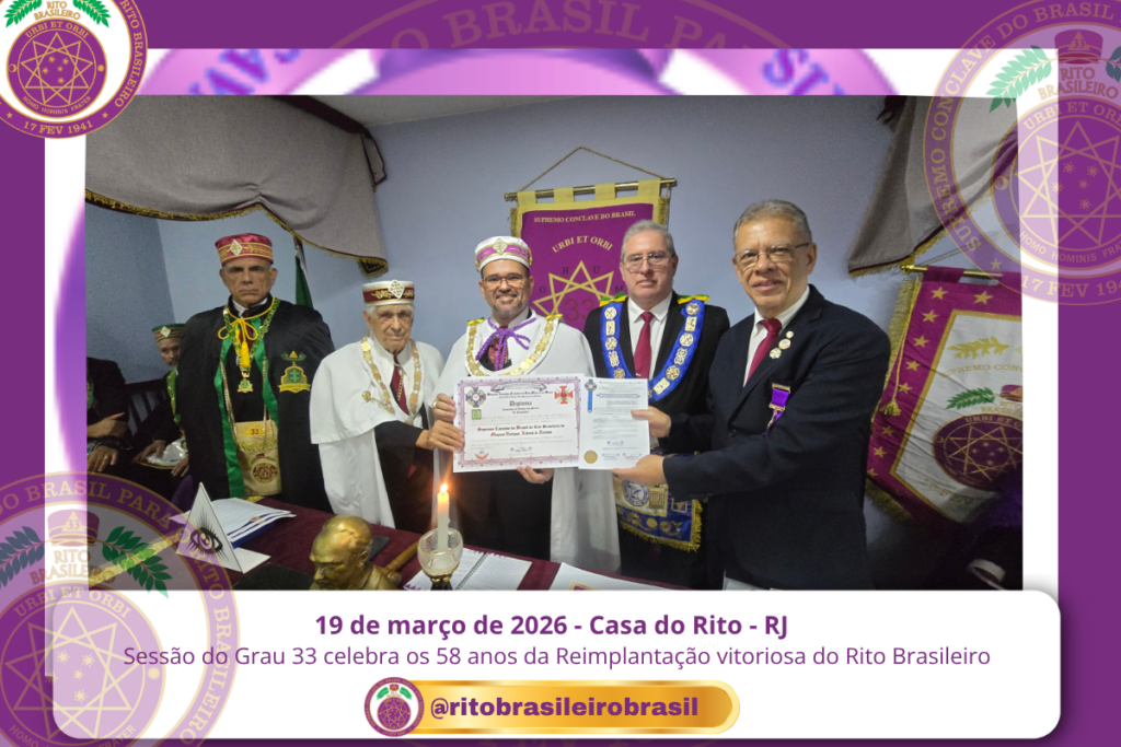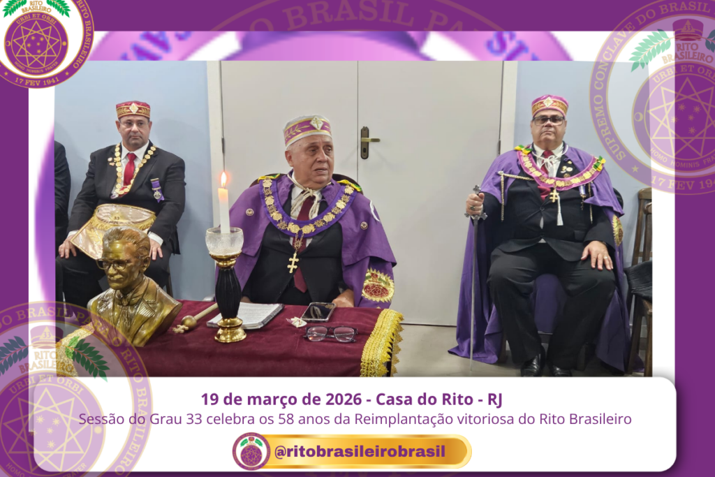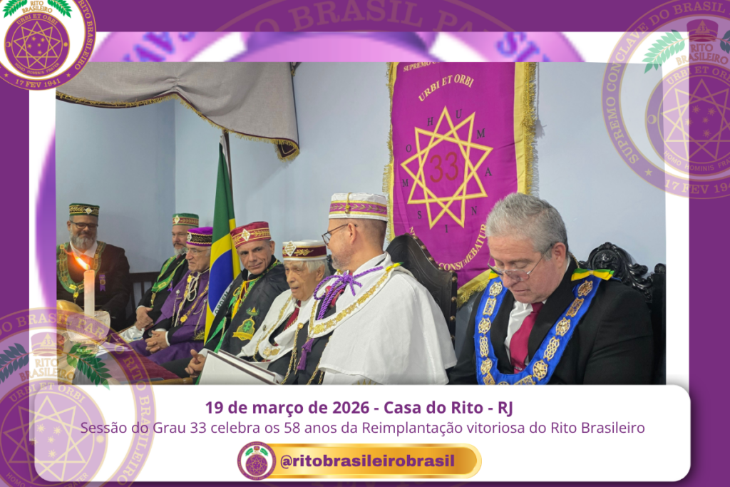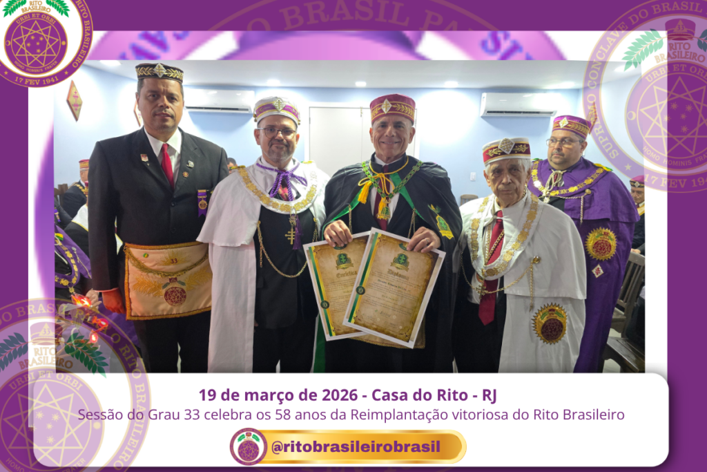 No dia 19 de março de 2026, data em que são celebrados os 58 anos da Reimplantação vitoriosa do Rito Brasileiro, a Casa do Rito Brasileiro foi palco de uma emocionante Sessão do Grau 33 – Servidor da Ordem, da Pátria e da Humanidade, reunindo Irmãos em um momento histórico de celebração e fortalecimento da Ordem.