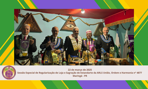 Na manhã do dia 22 de março de 2025, no Templo da Loja Maçônica 14 DE JULHO N° 1973, ocorreu a SESSÃO ESPECIAL DE REGULARIZAÇÃO E DE SAGRAÇÃO DO ESTANDARTE DA ARLS UNIÃO, PAZ E HARMONIA N° 4877, ao Oriente de Maringá, PR. Os trabalhos da Comissão Regularizadora e da Comissão Sagradora foram presididas pelo Pod. Ir. RENATO PAMPLONA, Grão-Mestre Adjunto do GOB-PR. No ensejo foi empossado o Venerável Mestre Provisório, Ir. ABDEL NASSER e sua administração.