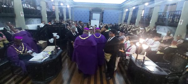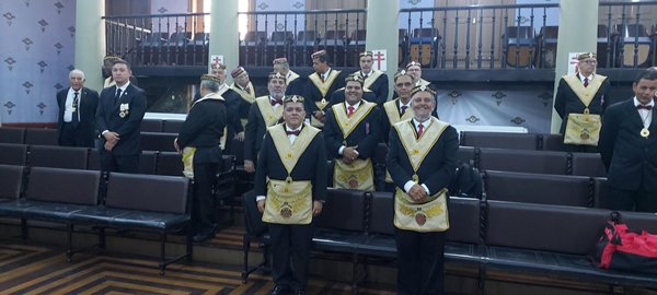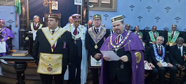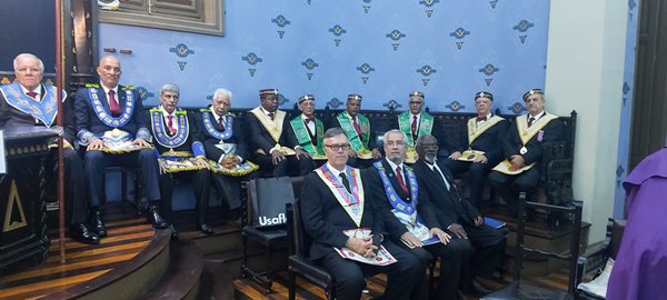 Ato contínuo deram ingresso, as autoridades maçônicas, do GOB e de Potência coirmã, o GORJ, que passamos a nominar, de acordo com a foto acima: Em.’. Ir.’. JAISSOM MIRANDA BELARDINO, exercendo o cargo de Grão Mestre em Exercício do GOB-RJ, o Sapientíssimo Ir.’. JORGE GOUVEA MELLO, Grão-Mestre do GORJ; Pod.’. Ir.’. EUCLIDES SAMPAIO FRÓES, Grão-Mestre Adjunto do GOB-RO; o Em.’. Ir.’. ADEMIR CÂNDIDO DA SILVA 33º, que no simbolismo é Grão-Mestre Geral Adjunto do GOB, licenciado, para concorrer ao cargo de Grão-Mestre Geral do GOB; o Em.’. Ir.’. ANDRÉ ROSA DOS SANTOS 33º, Grão-Mestre Adjnto do GOB-RJ, licenciado, para concorrer ao cargo de Grão-Mestre Estadual do GOB-RJ, conduzidos pelo Ser.’. Ir.’. ALEXANDRE DOS SANTOS DA COSTA 33º.Gr.’. M.’. de Cerimônias.