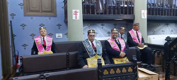 Os Eminentes Irmãos presidentes de Altos Corpos do Rito Brasileiro – em primeiro plano, à partir da esquerda, o Em.’. Ir.’. LINDENBERG MENDES VIANA 33º, Grande Prior do Poderoso GCKF GONÇALVES LEDO Nº 101 e o Em.’. Ir.’. MARCOS TEIXEIRA DE SÁ 33º, Aterzata do Ilustre e Sublime Capítulo TIRADENTES Nº 01; ao fundo, no mesmo sentido, o Em.’. Ir.’. PASCOAL ARGENTI SOBRINHO 33º, Aterzata do Ilustre e Sublime Capítulo NELSON NUNES Nº 110; o Em.’. Ir.’. CÉLIO LOPES DE ARAUJO 33º, Grande Prior do Poderoso GCKF NILO PEÇANHA Nº 103 e o Em.’. Ir.’. ROGÉRIO FAUSTINO DOS SANTOS 33º, Aterzata do Ilustre e Sublime Capítulo 18 DE SETEMBRO Nº 02