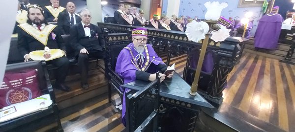 Em seguida, deu ingresso à Câmara de Grau 33, o Sob.’. Ir.’. Gr.’. Primaz NEI INOCENCIO DOS SANTOS 33º, acompanhado do Ser.’. Ir.’. JULIANO COELHO BRAGA 33ª, Gr.’. Regente e do Ser.’. Ir.’. GELCY CLOVES DIAS 33º, Gr.’. Orador, por eles conduzido até o seu Altar. (Foto acima)