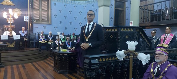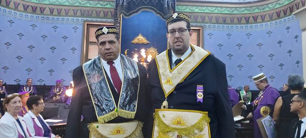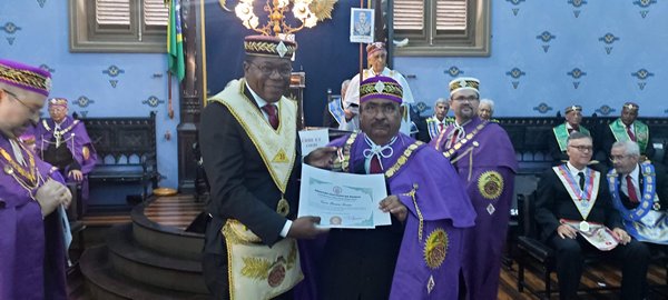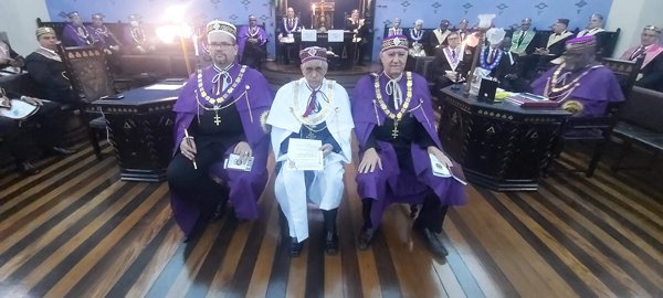 O Em.’. Ir.’. GEORGE DE OLIVEIRA COSTA 33º, foi revestido pelo seu padrinho o Em.’. Ir.’. VANDIR ENCARNAÇÃO DOS SANTOS. À sua direita, o Em.’. Ir.’. JOSÉ BATISTA DA SILVA JUNIOR 33º.