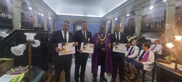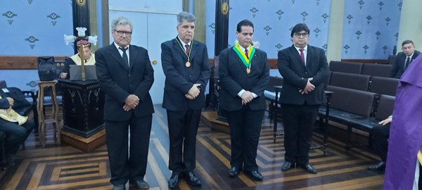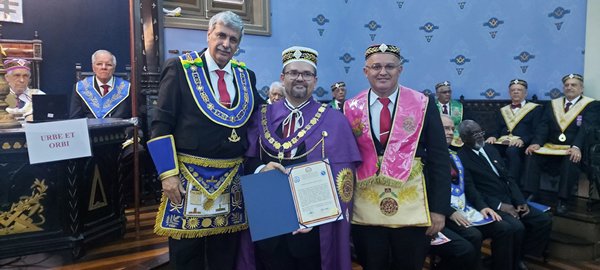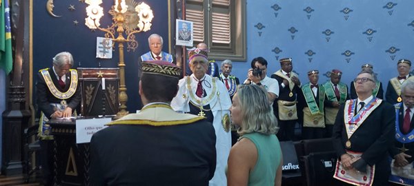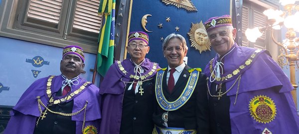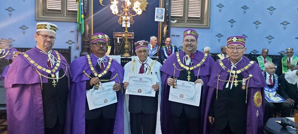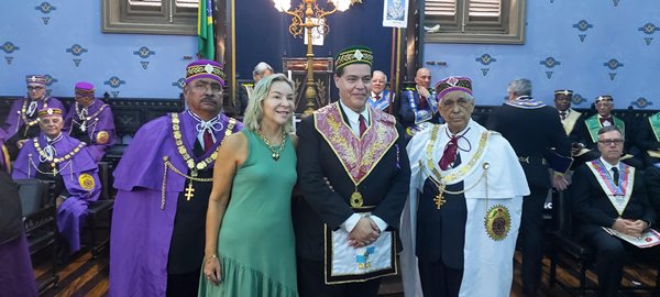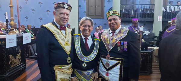 Na foto acima, à partir da esquerda, o Ser.’. Ir.’. UARA PEREIRA GOMES 33º, acunhada SANDRA MELLO BARRETO, o Em.’. Ir.’. LUIZ MAURÍCIO SARDINHA BARRETO 33º e o Sob.’. Ir.’. NEI INOCENCIO DOS SANTOS 33º