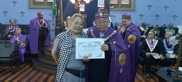 O Ir.’. JOSÉ TERUO MIZUNO 33º recebeu seu Diploma das mãos da sua esposa, a cunhada NEIDE YOKO MAGARIO MIZUNO