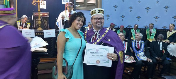Finalmente, o Sob.’. Ir.’. NEI INOCENCIO DOS SANTOS 33º, recebeu seu Diploma das mãos da sua esposa, a cunhada IVA VALENTE DOS SANTOS.