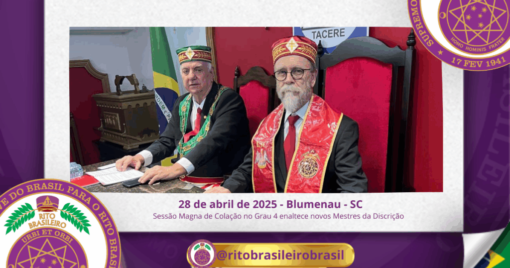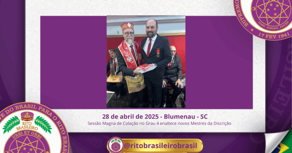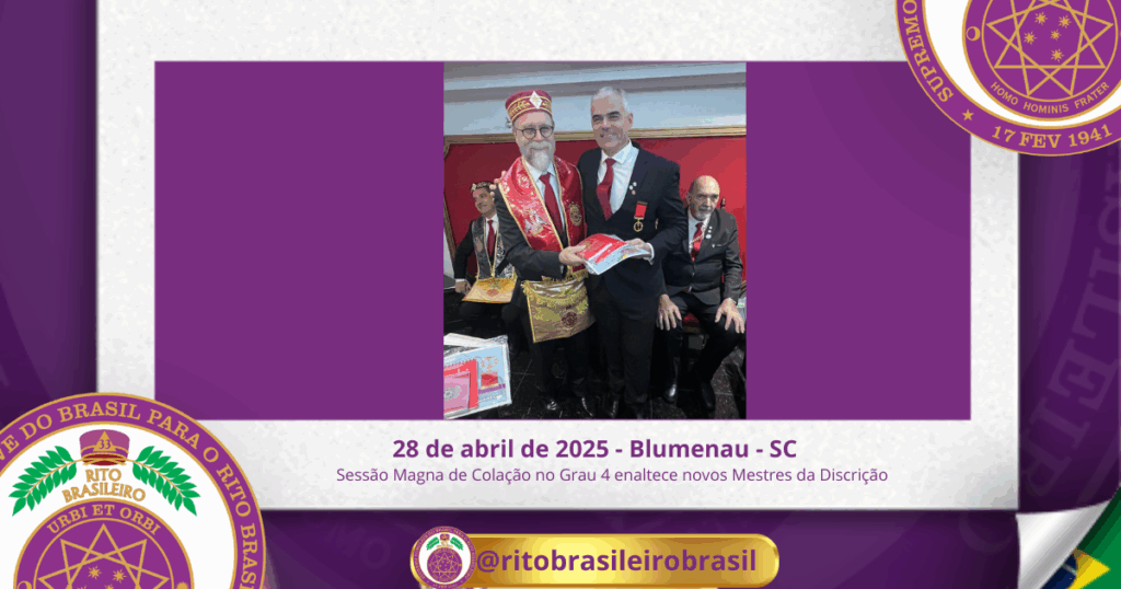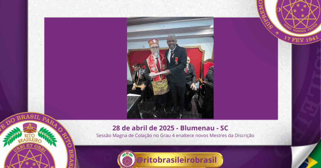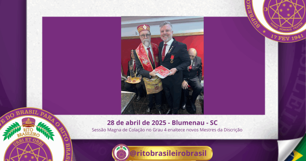 No dia vinte e oito de abril de dois mil e vinte e cinco, ao Clima de Blumenau/SC, foi realizada, no Ilustre e Sublime Capítulo Jefer Pinto nº 85, a Sessão Magna de Colação no Grau 4 – Mestre da Discrição, dos Ilustres Irmãos Carlos Eduardo Jacobowsky, Dávio Clayton Viana Mota, Marcos Bruno Gaulke, Jaison de Souza, João Roberto Marcelino e Rodrigo Vanzelli.