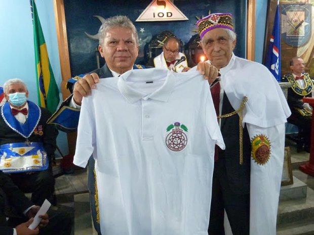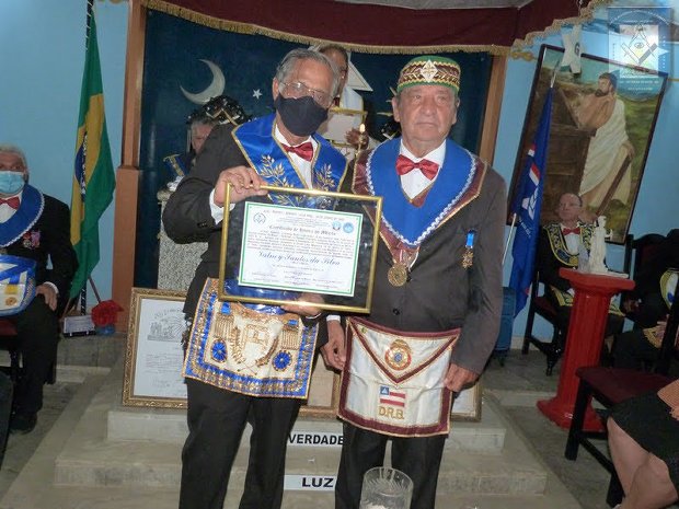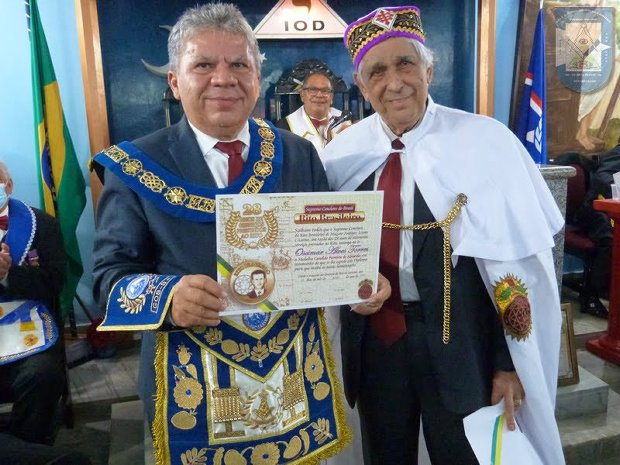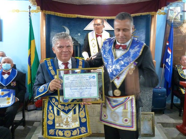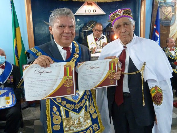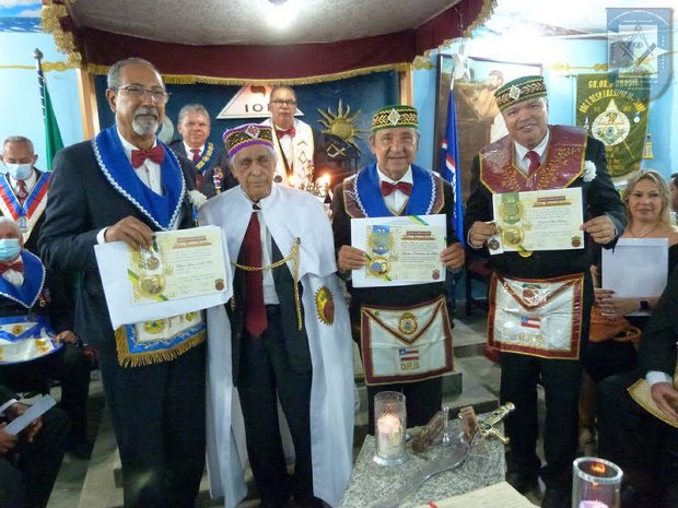 O Sob.’. Ir.’. NEI INOCENCIO DOS SANTOS 33º, Grande Primaz do Rito Brasileiro, na sequência da sessão, procedeu algumas homenagens, primeiramente ao Eminente Ir.’. Grão-Mestre Estadual do GOB-BA, OSCIMAR TORRES (Diploma de Permanência no Rito Brasileiro, Comenda e Diploma 52 Anos de Reimplantação do Rito Brasileiro, inclusive para o GOB-BA); ainda receberam seus Diplomas de Permanência no Rito Brasileiro os Irmãos MARCOS ANTÔNIO SÃO PEDRO, HIPÓLITO PEIXINHO 33º e ORISVALDO FÉLIX BARBOSA 33º. (Fotos acima)