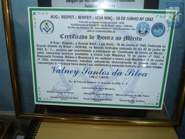Os Irmãos VALNEY SANTOS DA SILVA, NEI INOCENCIO e OSCIMAR TORRES, foram contemplados com um Diploma de Honra ao Mérito, conferido pela Loja.