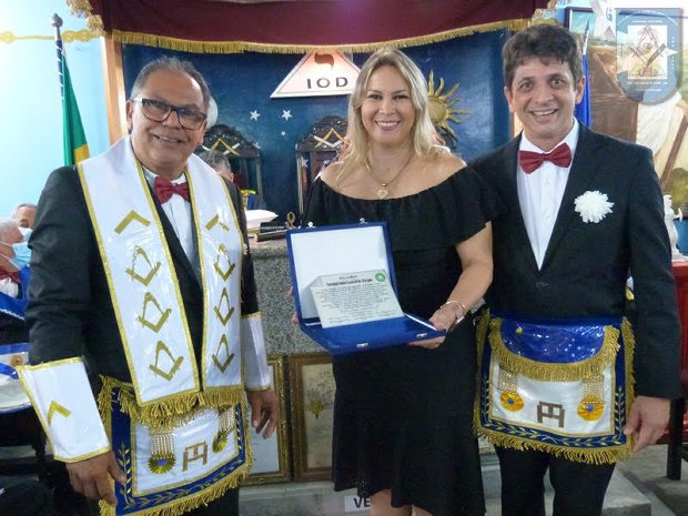 Ainda, a cunhada ELIANA CARDOSO, Presidente da Fraternidade Feminina, tendo ao lado o seu esposo, o Ir.’. DANILO, foi homenageada com a entrega de uma placa, pelo Ven.’. Mestre LUIZ CARLOS MONTEIRO.