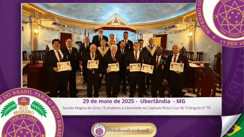 No dia vinte e nove de maio de dois mil e vinte e cinco, foi realizada no Ilustre e Sublime Capítulo Triângulo, nº 78, ao Vale de Uberlândia/MG, uma Solenidade Magna de Colação do Grau 15 – Cavaleiro da Liberdade, dentro da programação ritualística do Rito Brasileiro de Maçons Antigos, Livres e Aceitos.