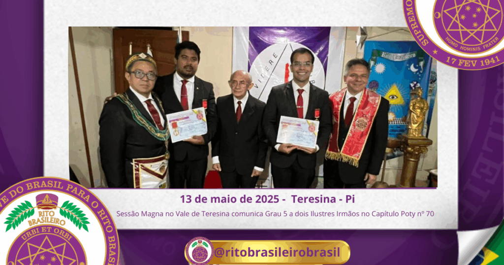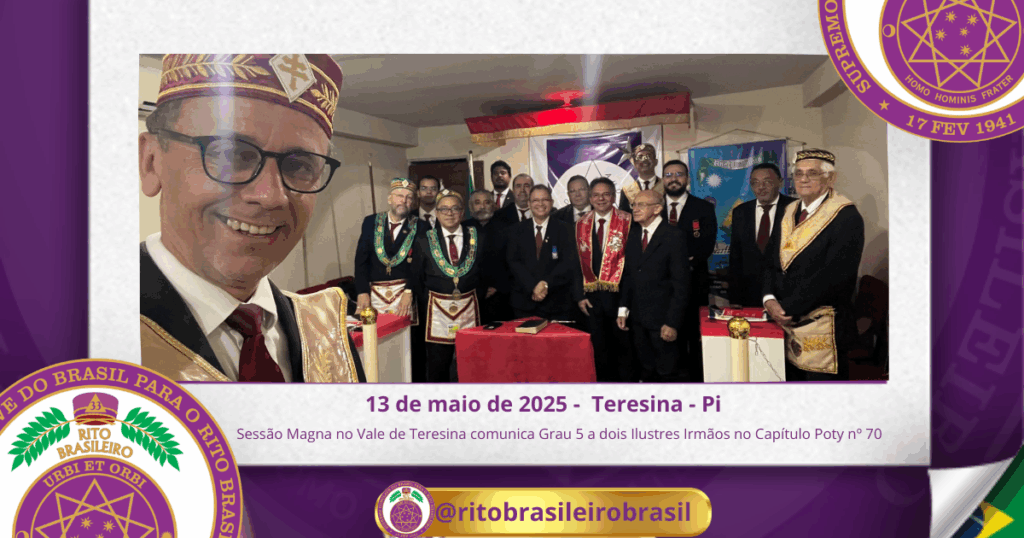 No dia treze de maio de dois mil e vinte e cinco, foi realizada, ao Vale de Teresina/PI, a Sessão de Comunicação do Grau 5 – Mestre da Discrição – no Ilustre e Sublime Capítulo Poty, nº 70.