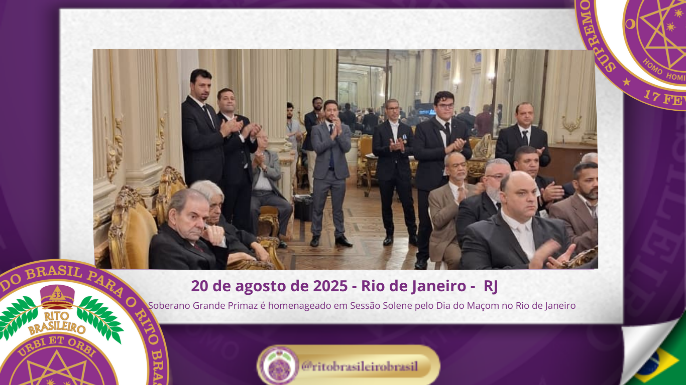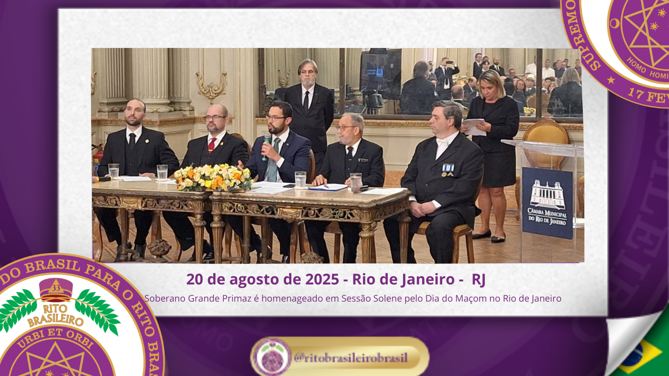 Em comemoração ao Dia do Maçom, celebrado em 20 de agosto de 2025, a Câmara Municipal do Rio de Janeiro realizou Sessão Solene presidida pelo Vereador Pedro Duarte. Na ocasião, o Soberano Grande Primaz esteve presente e integrou a mesa diretora, oportunidade em que proferiu discurso sobre a relevância desta data emblemática, destacando o papel do maçom na sociedade e convidando à reflexão os presentes.