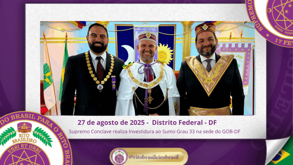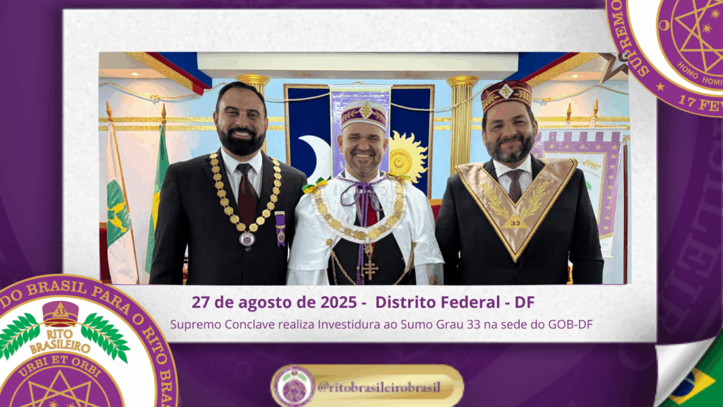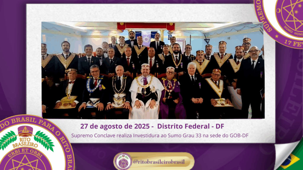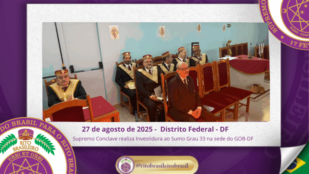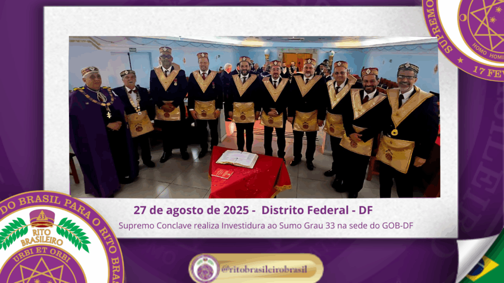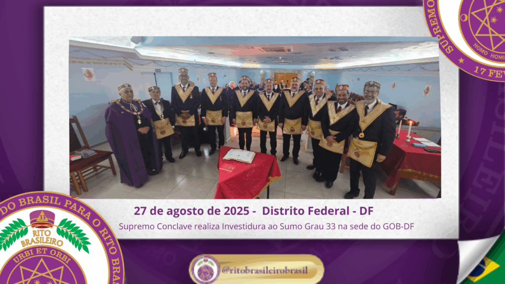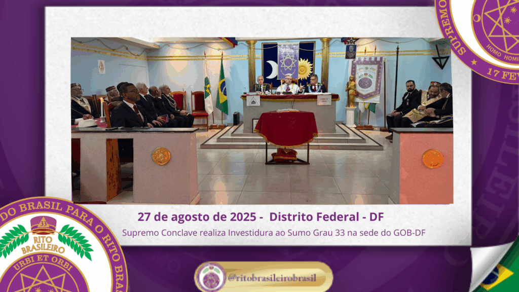 O Supremo Conclave do Brasil para o Rito Brasileiro de Maçons Antigos, Livres e Aceitos realizou, na sede do GOB-DF, uma emblemática Sessão Magna de Investidura ao Sumo Grau 33 – Servidor da Ordem, da Pátria e da Humanidade, recepcionando Irmãos de Ritos coirmãos e conferindo a mais alta dignidade do Rito a diversos Eminentes Irmãos.