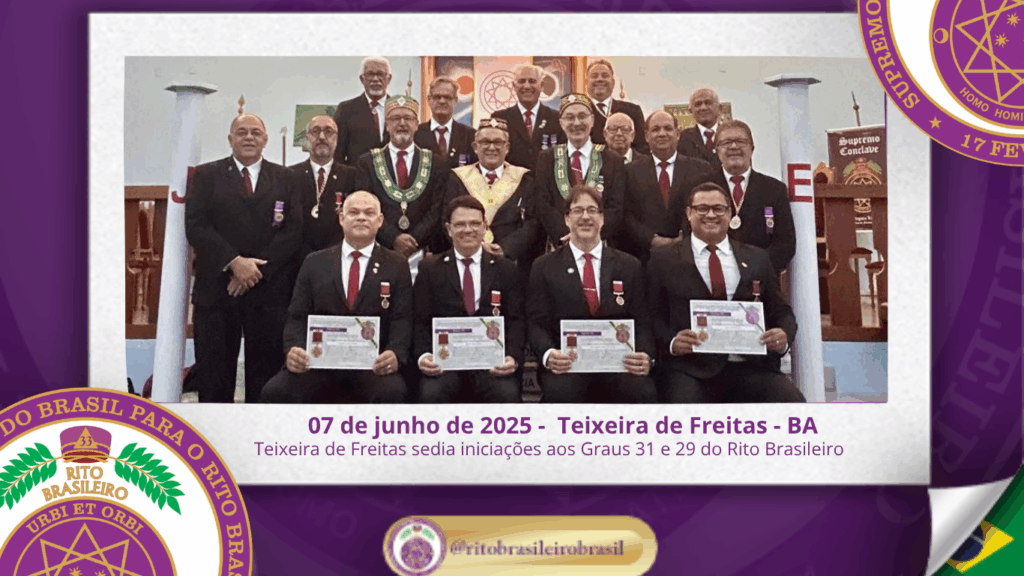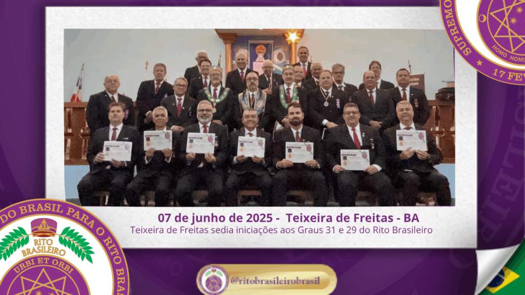 No dia sete de junho de dois mil e vinte e cinco, ao Vale de Teixeira de Freitas – Bahia, o Supremo Conclave do Brasil para o Rito Brasileiro de Maçons Antigos, Livres e Aceitos testemunhou dois importantes momentos na jornada filosófica dos obreiros do Rito, com a realização de iniciações aos Graus 31 e 29 da hierarquia dos Altos Graus Filosóficos.
