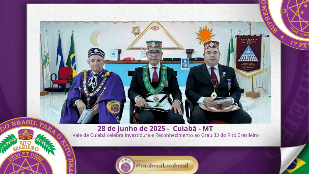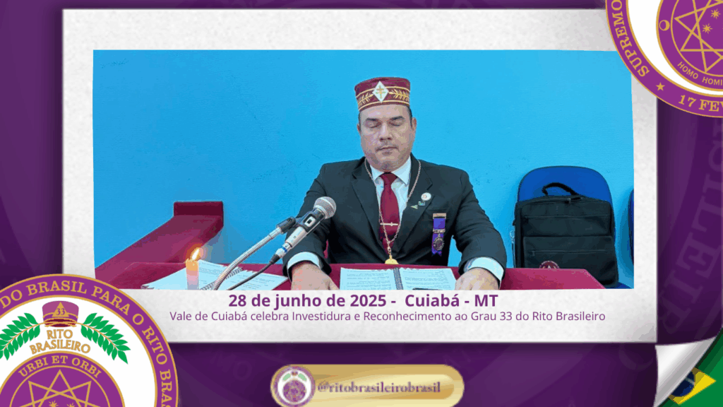 Aos vinte e oito dias do mês de junho de dois mil e vinte e cinco, ao Vale de Cuiabá, ao Clima de Mato Grosso, foi realizada uma marcante Sessão de Investidura e Reconhecimento ao Grau 33 – Servidor da Ordem, da Pátria e da Humanidade, promovida pela Delegacia Litúrgica do Rito Brasileiro no Estado.