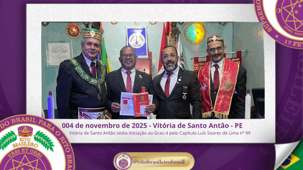 No dia quatro de novembro de dois mil e vinte e cinco, ao Vale de Vitória de Santo Antão, ao Clima de Pernambuco, o Supremo Conclave do Brasil para o Rito Brasileiro de Maçons Antigos, Livres e Aceitos, por meio de O Ilustre e Sublime Capítulo Luís Soares de Lima nº 99, jurisdicionado à 1ª Delegacia Litúrgica de Pernambuco, realizou uma Sessão Magna de Iniciação ao Grau 4 – Mestre da Discrição, pertencente à hierarquia dos Altos Graus Filosóficos do Rito Brasileiro.
